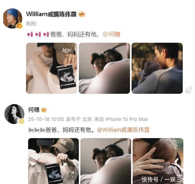 10月18日,港星陈伟霆官宣妻子何穗产子。他在社交平台发文称: 爸爸、妈妈还有他。 而何穗也同步在社交平台发布了喜讯。